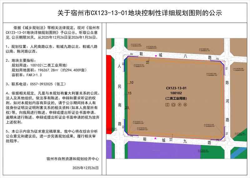 关于宿州市CX123-13-01地块控制性详细规划图则的公示