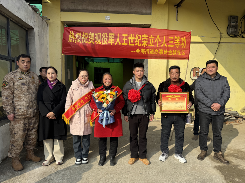 鼓声阵阵传捷报,锣鸣声声庆荣光。2月3日上午,伴随着铿锵喜庆的锣鼓声,金海街道党工委书记闫雪,党工委委员、办事处副主任郭永坤携退役军人服务站工作人员一行,前往武警某支队现役军人王世纪家中,将烫金的三等功喜报及慰问品郑重送到其手中,用最具仪式感的方式,传递这份属于军人的崇高荣誉,向为国家培养优秀卫士的军属致以最诚挚的敬意。