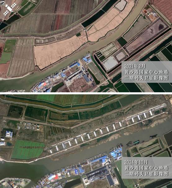 解读:2021年2月施工初期(上图)对比2024年10月(下图),黄沙港国家中心渔港二期工程码头主体已建成。